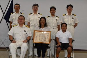 宮古島海上保安部(喜志多健史部長)は、7月14日に吉野海岸で発生した溺水事故の救助活動に対する感謝状を山田敬子さん(平良在住)に贈呈した。贈呈式は21日、平良港湾合同庁舎で行われ、喜志多部長から山田さんに手渡された。