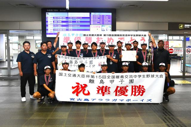 長崎県の壱岐島で開催された国土交通大臣杯第15回全国離島交流中学生野球大会(通称・離島甲子園)で準優勝した宮古島アララガマボーイズが23日、帰島した。宮古空港では保護者や学校関係者らが拍手で出迎え健闘をたたえた。