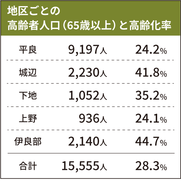 市の65歳以上の高齢者人口は、2024年3月末現在で1万5555人となり、総人口の5万5026人に占める割合は28・3%となり、依然として「超高齢社会」であることが市高齢者支援課のまとめで分かった。前年同期から0・5の上昇で4人に1人以上が高齢者となる。地域別で最も高齢化率が高いのは伊良部地区の44・7%だった。