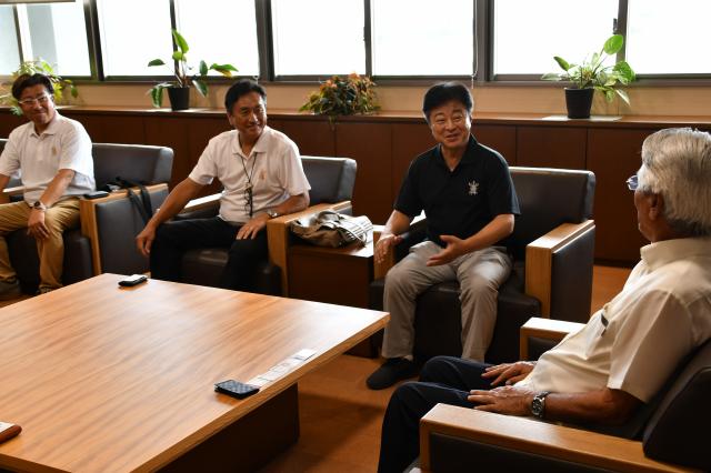 宮古島市の友好都市、熊本県山鹿市の早田順一市長らが26日、市役所で座喜味一幸市長と談笑した。民間事業者で交流の輪を広げることを目的に山鹿市の経済団体の関係者らと来島。座喜味市長は「ようこそ宮古島へ。皆さんとは心がつながっている。交流の分野が広がり、うれしく思う」と歓迎した。