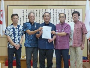 【那覇支社】県観光業35団体で構成する沖縄ツーリズム産業団体協議会(下地芳郎会長)は27日、県議会の中川京貴議長を訪ね、県内の宿泊税制度の導入について陳情書を提出した。下地会長から中川議長へ手渡し、定率による課税や県民を免除対象者とすることなどを求めた。