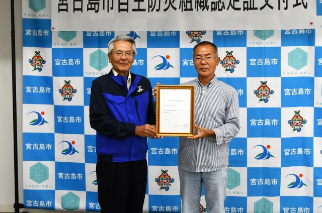 市による自主防災組織への認定証交付式が29日、市役所で行われ、座喜味一幸市長から大浦自治会自主防災会の砂川保会長に認定証が手渡された。市と「自分たちの地域は自分たちで守る」との目標を掲げて組織された同自主防災会は安全安心で住みよい地域づくりに向けてさらなる連携強化を図るとしている。