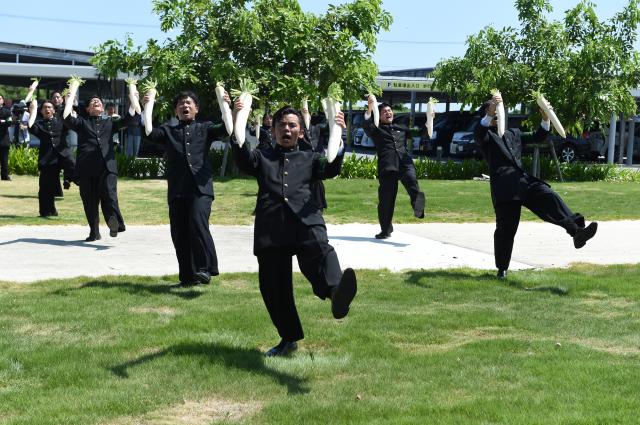 8月27日から宮古夏季合宿を行っている東京農業大学の全学応援団が2日、座喜味一幸市長に合宿の報告を行うとともに、市役所前で名物の「青山ほとり(通称・大根踊り)」などを披露した。市職員や来庁者、保育園児が見学に訪れ、一糸乱れぬ動作と迫力のある「応援」に見入った。