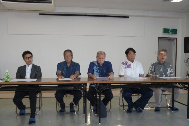 会見で協力を呼び掛ける新政会と県教組宮古支部のメンバー=5日、宮古教育会館