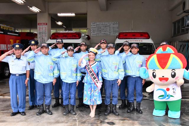 「救急の日」および「救急医療週間」に伴い市消防本部は9日、正しい救急医療と業務に対する周知活動の一環として、第50代ミス宮古島(ミスサンゴ)の坂田祐梨さんに1日救急隊長の辞令を交付するとともに、市役所でチラシ配布を行い、市民に適正な利用を呼び掛けた。