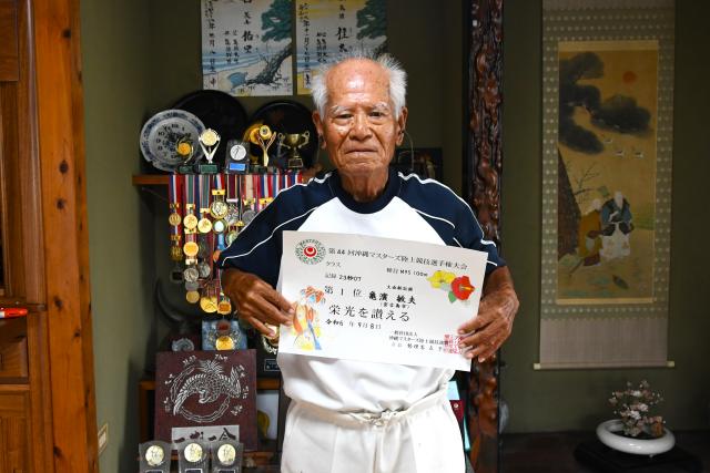 第44回沖縄マスターズ陸上競技選手権大会に出場した亀濱敏夫さん(98)がM95(男子95~99歳)クラスの100㍍で23秒07の大会新記録で優勝、60㍍、200㍍も制し3冠を達成した。21日から京都府で開かれる全日本大会に出場する。亀濱さんは「結果は気にせず、普段通りに走って楽しみたい」と語った。