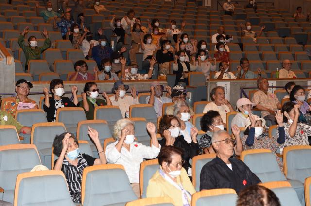 市主催の平良地区敬老会が13日、マティダ市民劇場で開かれた。70歳以上6688人を盛大に祝い、健康長寿に期待を込めた。高齢者らはステージで繰り広げられる多彩なプログラムを楽しみ、会場は笑顔であふれていた。敬老会に仲間入りした新70歳は541人、88歳の米寿を迎えたのは173人、新100歳は12人だった。