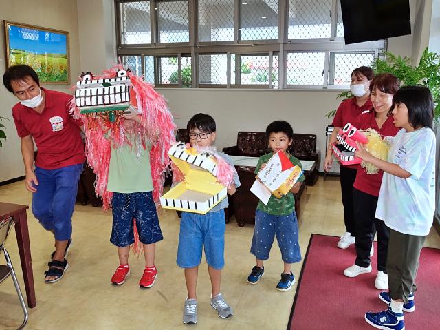 合同会社ミックスが運営するキッズステーション「ココア」に通う子どもたちが13日、宮古毎日新聞社を訪れ、「シーシャガウガウ」を披露した。