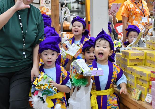 旧暦8月15日「十五夜」の17日、平良の市街地では子どもたちが手作りの獅子で厄を払う「シーシャガウガウ」の光景が見られた。あけぼの保育園(下地聖子園長)は4、5歳児29人が島の駅みやこを訪れ、「商売繁盛。シーシャガウガウ」と声を合わせ手作り獅子の口を鳴らしながら店内を回って厄を払い、職員や保護者から菓子をもらって笑顔を見せていた。