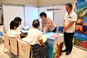 2025年3月に卒業する高校生などを対象にした「宮古島地域企業説明会・面接会」(主催・宮古公共職業安定所など)が19日、市未来創造センターで行われた。市内の3高校から21人が参加。生徒たちは興味のある事業所や職種のブースを回り、担当者から話を聞いた。