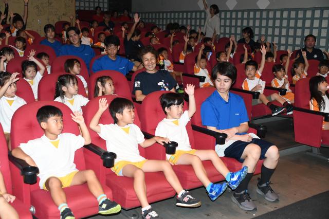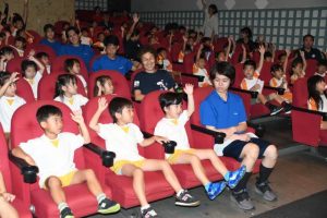 県労働金庫宮古支店(内間陽大支店長)は20日、保育園児や幼稚園児85人をよしもと南の島パニパニシネマに招待し映画観賞会を開いた。園児たちは観光バスで映画館まで移動し、映画館からプレゼントされたポップコーンを食べながら「怪盗グルーのミニオン超変身」を観て楽しいひとときを過ごした。