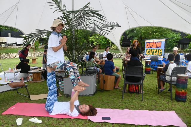 平良西里のホテルローカルベース内で22日、クラフターズマーケットが開催された。島内のアーティストによるハンドメイド雑貨の販売、キッチンカーなどのマーケットのほか、アートやアクロヨガ、打楽器体験ワークショップ(WS)など多彩なイベントに多くの家族連れなどが参加し楽しんだ。