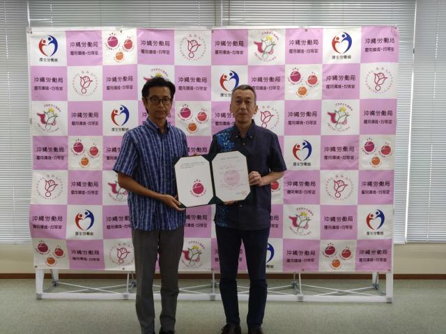 女性活躍推進法に基づく認定企業(通称・えるぼし認定)に、不動産賃貸業「リヴプラス」(下地市朗社長)が宮古島市の企業として初認定され、最上位の三つ星を取得した。24日に那覇第2地方合同庁舎で交付式があり、沖縄労働局の柴田栄二郎局長が同社の岩瀬英治専務に認定通知書を手渡した。
