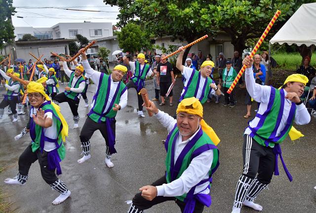 下地来間島の伝統行事「ヤーマスプナカ」は2日目の28日、集落内を練り歩くパレードが、断続的に雨が降るあいにくの天気の中で行われ、島の人々が棒踊りや奉納踊りで、向こう1年間の無病息災や五穀豊穣(ほうじょう)などを祈願した。パレード後は「雨乞い座」と呼ばれる広場で、3兄弟の一族が島の繁栄を祈願する棒振りを披露するなど盛大に祝宴を催し、島のさらなる発展と子孫繁栄を願った。