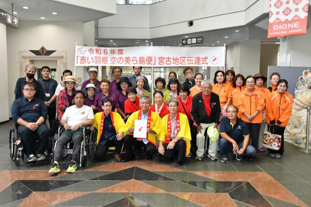 2024年度赤い羽根共同募金運動が1日から始まり、宮古空港で「赤い羽根空の美(ちゅ)ら島便」宮古地区伝達式が行われた。日本トランスオーシャン航空(JTA)客室乗務員の在川希さんから県知事メッセージを受け取った県共同募金会宮古島市共同募金委員会(野原勝会長)の砂川信雄事務局長が今年度の目標達成に意欲を示しながら市民や関係者の協力を呼び掛けた。