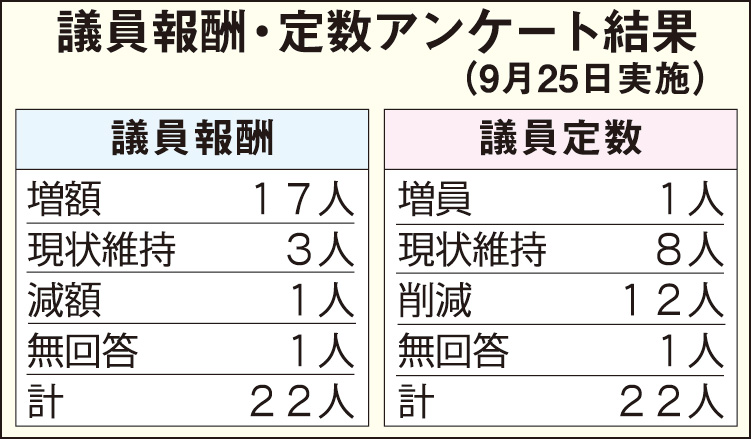市長、副市長、教育長のほか市議会議員などの給料と報酬を協議する市特別職等報酬審議会が早ければ今月中にも開催の予定。それに向け、本紙では9月25日の市議会9月定例会の最終本会議に出席していた市議22人にアンケートを実施した。その結果、「報酬増」に賛成は17人。報酬問題を協議する際の前提協議となる「定数削減」については12人が賛成の意思を示した。今後、議員間で激しい論戦が展開される見込みだ。