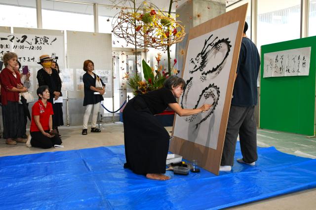 第19回市民総合文化祭一般展示の部2日目の12日、会場の市未来創造センターには多くの市民が訪れ、園芸や美術・写真などの感性あふれる作品に触れたり、盆栽や茶道などのワークショップを楽しんだりした。書道では、下地出身でアメリカ在住のマキャン千加子さんらが実演パフォーマンスを行い、今年の干支の「辰(龍)」の墨絵を描き、見物客を沸かせた。