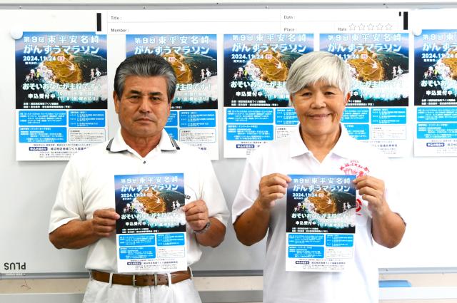 「第9回東平安名崎がんずうマラソン」(主催・城辺地区地域づくり協議会)が11月24日に開催。参加申し込み受け付けが16日から始まった。同協議会の宮國恵良会長らが同日、城辺公民館で会見を開いて概要を発表し、多数の参加を呼び掛けた。