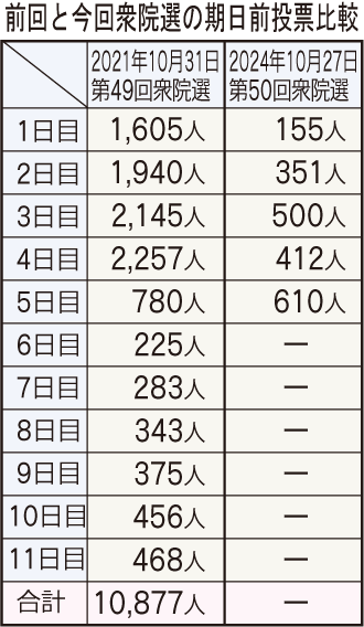 市役所で行われている第50回衆院選の期日前投票は前半の20日までに5日間で計2028人(男性1085人、女性943人)となっている。前回の同期間は計8727人(男性4152人、女性4575人)。前回は市議選と日程がほぼ重なっていたため、単純比較できないが、約4分の1と大幅に下回る状況となっている。期日前投票は投票日前日の26日まで。時間は午前8時半~午後8時。