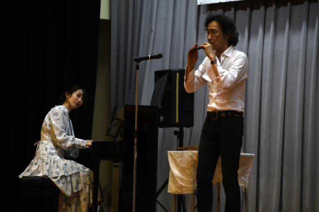世界的に活躍する雅楽師の東儀秀樹さんが24日、下地中学校を訪れ講話を通して楽器の紹介や演奏を行った。参加した小中学生188人は普段聞くことのできない雅楽の楽器の独特な音色に魅了された。