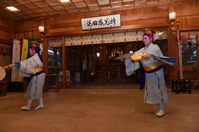 宮古神社で25日、宵宮祭が行われた。きょう26日に開催される例大祭の前夜祭に当たり、訪れた参拝者はこの1年間を無事に過ごせたことに感謝し、向こう1年間の五穀豊穣(ほうじょう)、無病息災、家内安全などを祈願した。神前では、舞踊や獅子舞、歌などが奉納された。