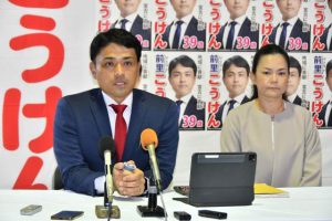 市議会議員の前里光健氏(42)は29日、平良下里の後援会事務所で会見を開き、来年1月(12日告示、19日投開票)の第6回宮古島市長選挙に出馬することを表明した。「諸課題の解決に向けて取り組んでいきたいという強い思いから市長選に臨む決意をした。すべての住民が住んで良かったなどと誇れる街づくり、地域づくりをしていきたい」と決意を示した。