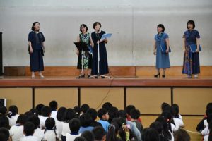 平良第一小学校(與那覇盛彦校長)は30日、学校創立142周年を迎え、卒業生らが母校でミニコンサートとキャリア講話を行った。卒業生らは、挑戦することや思いやりの心を持つことを伝えたほか、後輩たちの健やかな成長を願った。