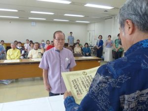 【那覇支社】27日に投開票された第50回衆院選の県内小選挙区で当選した4氏への当選証書付与式が30日、県庁で行われた。県選挙管理委員会の武田昌則委員長が手渡した。