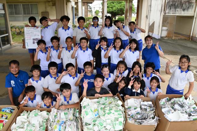 上野小学校(與那覇修校長)5年生は31日、4月から半年間かけて集めてきた牛乳パック約80㌔を市環境保全課へ手渡した。集めた牛乳パックは「市ゴミ減量化啓発事業」に活用されトイレットペーパーにリサイクルされる。