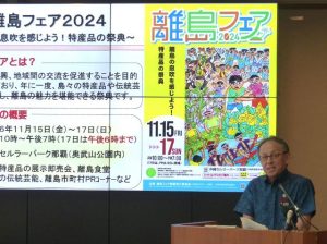 【那覇支社】玉城デニー知事は31日、県庁で定例記者会見を開き、「離島フェア2024(主催・同開催実行委員会)」の開催について発表した。今年は11月15~17日に沖縄セルラーパーク那覇(奥武山公園)で行われる。テーマは「離島の息吹を感じよう!特産品の祭典」。