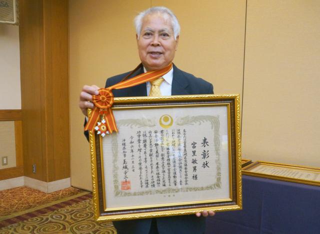 【那覇支社】2024年度県功労者表彰者式が3日、那覇市で開催され、各分野で貢献、尽力した12人に玉城デニー知事から表彰状と記念メダルが贈呈された。宮古島市からは、社会福祉部門で長年にわたり交通安全活動に携わり、宮古島地区交通安全協会長、県交通安全協会評議員を歴任した宮里敏男さん(82)が表彰された。宮里さんは「これまで以上に地域貢献ができると思う」と述べた。