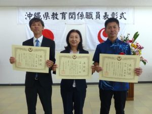 【那覇支社】2024年度県教育関係職員表彰式が6日、県庁で行われ、県内の教育関係職員ら計41人へ表彰状が授与された。宮古からは、優秀教職員部門で上地洋平教諭(北小)、垣花雄盛教諭(平良中)、與那原江里子教諭(宮古特別支援学校)の3人と、功労者部門に近藤美江子教諭(下地小)がそれぞれ表彰された。