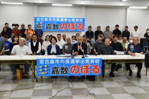 前副市長の嘉数登氏(61)が8日、平良西里の事務所で会見を開き、来年1月(12日告示、19日投開票)の宮古島市長選挙に保守系無所属の立場で出馬することを表明した。若者の島外への流出防止や出生率の向上を政策の1丁目1番地に掲げ、九つの政策を発表。県行政を34年間、副市長を1年半務めるなど豊富な行政経験を強調した嘉数氏は「市民が誇りに思うような豊かで明るい宮古島市を目指したい」と意気込みを述べた。