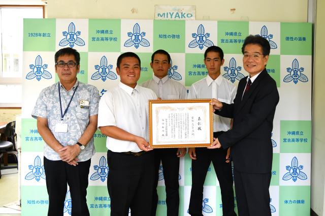 来年春に甲子園球場で開催される第97回選抜高校野球大会(センバツ)の21世紀枠の県候補に選出された宮古高校に8日、推薦校決定をたたえる表彰状が伝達された。表彰は日本高等学校野球連盟と毎日新聞社の連名。野球部主将の与那覇寛大さんは「まだ、決定したわけではないが、地域や子どもたちに夢を与えるチームを目指していきたい」と語った。
