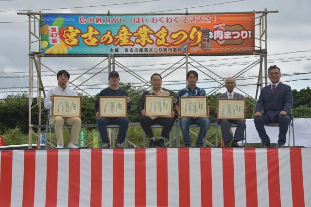 市の産業振興に寄与した人をたたえる2024年度の産業振興賞表彰式が23日、宮古の産業まつり会場の市役所で行われた。農林水産部門に3人、商工観光部門に2人の計5人に、同まつり実行委員会会長の根路銘康文宮古島商工会議所会頭から表彰状と記念品が手渡された。