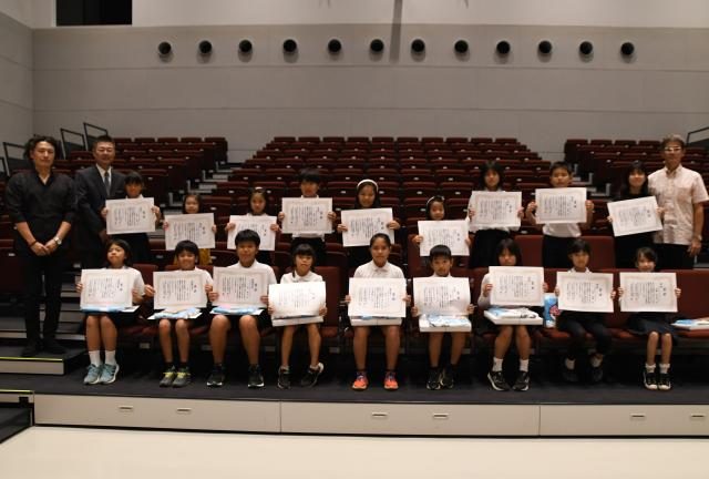 県内離島などの小学生を対象にした第42回JTA(日本トランスオーシャン航空)・RAC(琉球エアーコミューター)あおぞら図画コンクールの宮古地区表彰式が27日、市未来創造センター多目的ホールで行われた。最優秀賞3人、優秀賞2人、佳作16人の合わせて21人にJTA宮古支社の玉城力支社長が賞状を手渡した。