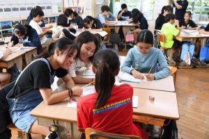 日本郵便沖縄支社は3日、久松小学校で年賀状の書き方体験授業を開いた。那覇、宮古、平良久貝の各郵便局から6人の局員が参加し、6年生に年賀状の由来などを話しながら書き方を指導した。