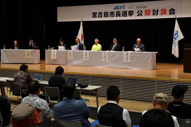 次期市長選への出馬を表明している5氏を招いての「宮古島市長選挙公開討論会」(主催・宮古青年会議所)が11日、市未来創造センターで開かれた。市議の前里光健氏(42)、前副市長の嘉数登氏(61)、2選を目指す現職の座喜味一幸氏(74)、元県企画部長の下地明和氏(67)、会社代表の豊見山徹氏(64)が登壇し、それぞれの政策などを通して市の課題解決への意気込みを示した。討論会は動画配信サイト「YouTube(ユーチューブ)」でもライブ配信された。