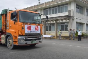宮古製糖(山城一成社長)は19日、2024-25年期サトウキビの分蜜糖を初出荷した。出発に先立ち、分蜜糖を積んだ車両は酒と塩で清められた後、関係者らに拍手で見送られた。平良港へ到着すると分蜜糖は専用のベルトコンベヤーを使って船倉に流し込まれた。20日も搬入が行われ、合計約1000㌧を積み込み、福岡県に向け出港する。