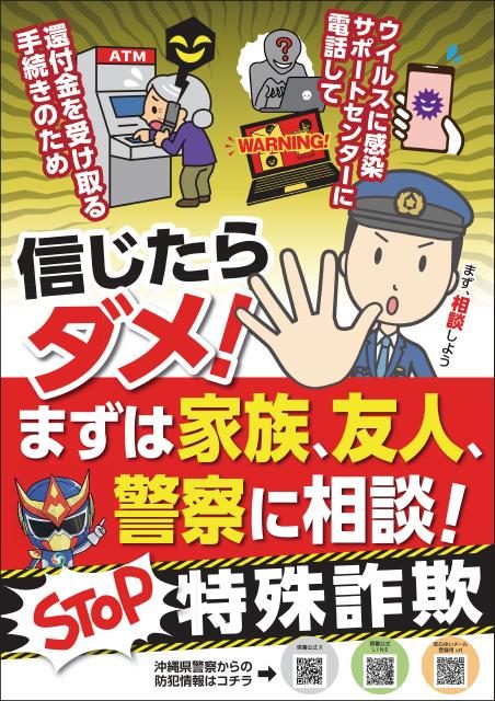 宮古島署は20日、県内全域で特殊詐欺被害が相次いでいることから、市の防災無線で注意を呼び掛ける放送を開始した。来年1月10日までの期間中、1日2回(午前11時と午後5時半)、「警察官や市役所職員が電話やSNSのみでATMを操作させたり、お金を振り込ませたりすることは絶対にありません」などと流れる。今年は12月19日現在、宮古島署管内で10件の特殊詐欺被害が発生し、被害総額は約1500万円に上っている。