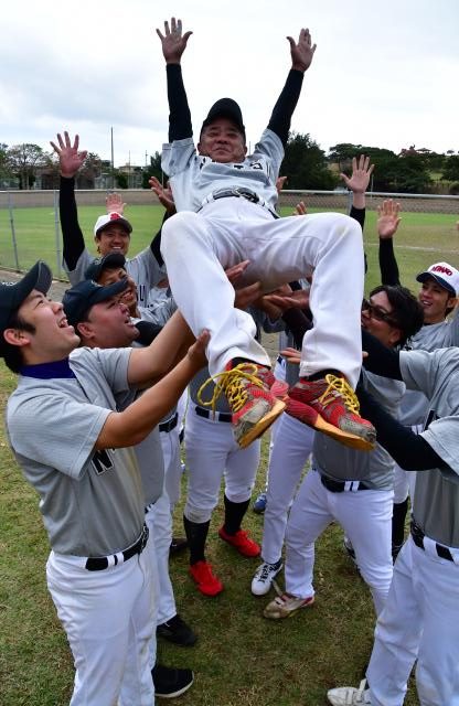 砂川監督を胴上げする「さとうきびニッツ」ナイン=22日、市営球場