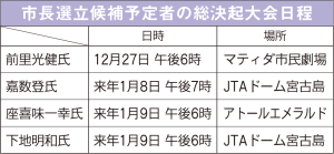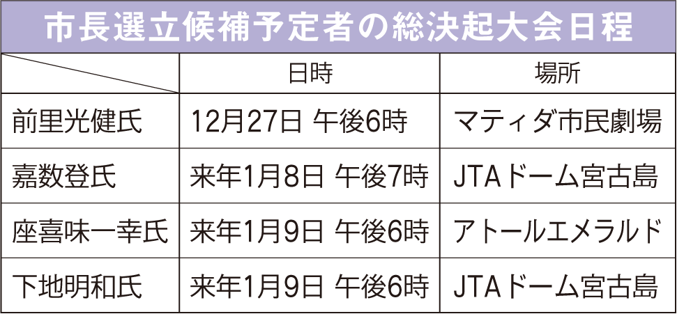 任期満了に伴う宮古島市長選挙(1月12日告示、同19日投開票)へ向け、出馬を表明している現職の座喜味一幸氏(75)、いずれも新人の下地明和氏(67)、嘉数登氏(61)、前里光健氏(42)の総決起大会の日程が決まった。あす27日の前里氏を皮切りに、年明け早々の8日に嘉数氏、9日には座喜味氏と下地氏が総決起を予定している。豊見山徹氏(64)については未定。市長選に向けては交差点でのアピールなど市議会12月定例会後から街頭活動などが展開されており、各陣営とも動きが活発化している。