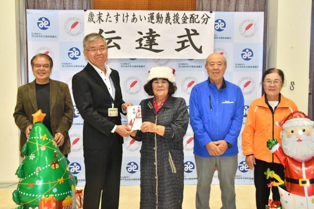 2024年度歳末たすけあい義援金の伝達式が25日、平良老人福祉センターで行われた。市社会福祉協議会の砂川信雄事務局長から目録を受け取った市民生委員児童委員協議会の砂川美枝子会長は、「すてきな新年が迎えられるよう、思いを込めて担当地区にしっかりと配分したい」と述べた。