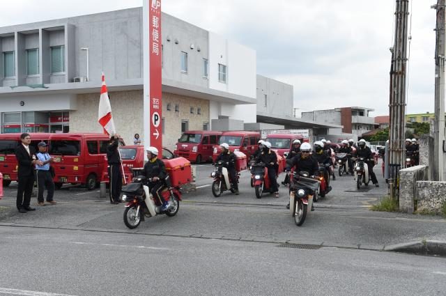 宮古郵便局(保久村昌治局長)は1日午前8時半から、年賀状を届ける配達出発式を同局で行った。昨年末から準備してきた郵便局員らが、オートバイで各家庭に新年のあいさつ、近況などを伝える気持ちのこもった年賀状を届けた。宮古で元旦に届けられた年賀状は約7万通。