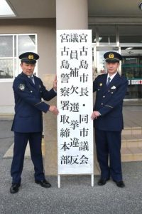 宮古島警察署(新垣健一郎署長)は8日、市長選挙、市議会議員補欠選挙(12日告示、19日投開票)に伴う選挙違反取締本部を同署内に設置した。正面玄関に看板を掲げ、公平公正な選挙が行われるようアピールするとともに取り締まりの強化に決意を新たにした。同署によると8日までに、のぼりやポスターなど、37件の掲示違反が確認されている。
