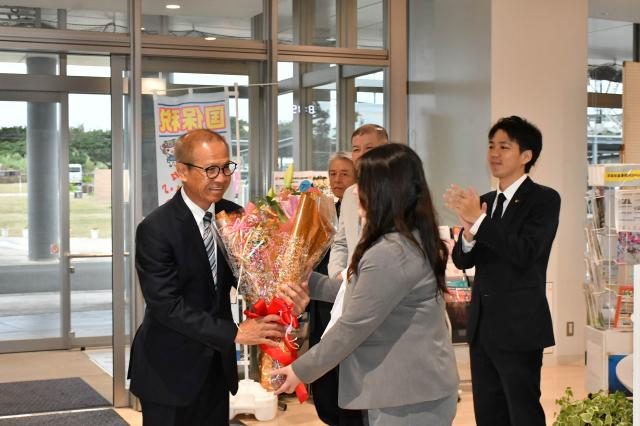 嘉数登市長が27日、市役所に初登庁した。嘉数市長は午前8時15分ごろ、紺色のスーツ姿で現れ、支持者や職員、市議会議員からの出迎えを受けて笑顔で庁舎内に足を踏み入れた。