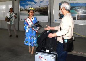 宮古島観光協会と下地島エアポートマネジメントは30日、ソラシドエアのチャーター便(大分-下地島線)で訪れた観光客らを歓迎するセレモニーを下地島空港で行った。ミス宮古島の坂田祐梨(ゆり)さんや関係職員らが168人の乗客を「ようこそ宮古島へ」と声を掛けて出迎えた。