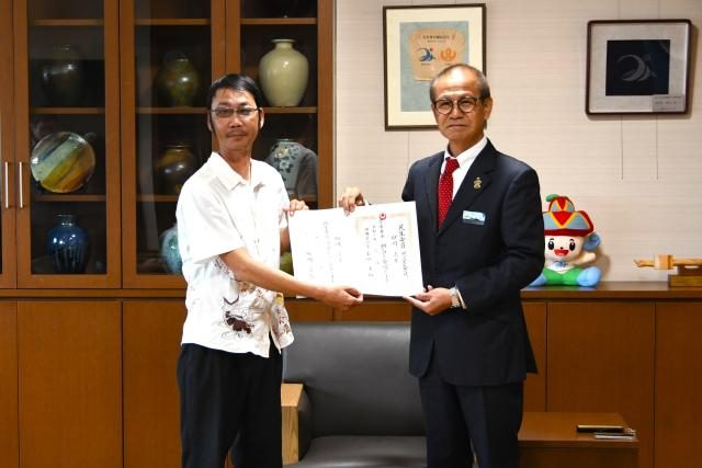 民生委員・児童委員への委嘱状伝達式が6日、市役所で行われた。福岡資麿厚生労働大臣と玉城康裕(デニー)県知事からの委嘱状を嘉数登市長が新たに委員となる砂川元幸さん(42)に手渡した。