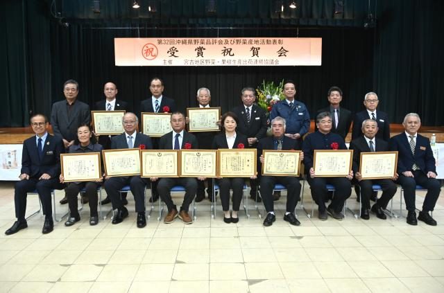 第32回県野菜品評会および野菜産地活動表彰受賞祝賀会(主催・JAおきなわ宮古地区野菜・果樹生産出荷連絡協議会)が7日、JAおきなわ宮古地区本部大ホールで開催された。会場には受賞者をはじめ嘉数登市長、JAおきなわの安谷屋行正代表理事専務ら来賓のほか生産農家が出席し、受賞者を祝うとともに島産野菜の品質向上へ決意を新たにした。