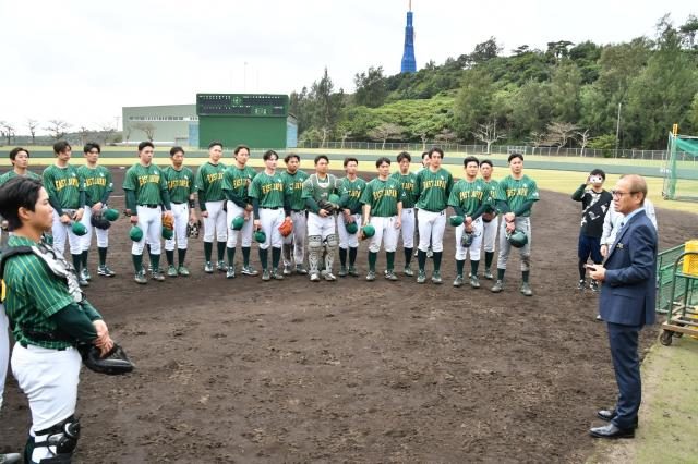 嘉数登市長は18日、市内で春季キャンプを実施しているJR東日本野球部と立正大硬式野球部の2チームの元を訪れ、選手らを激励した。地元産の黒糖1箱を贈呈したほか、嘉数市長は「市を挙げて皆さんを歓迎する。温暖な宮古島で練習を積んで、それぞれの目標を達成してほしい」と新シーズンの活躍を期待した。